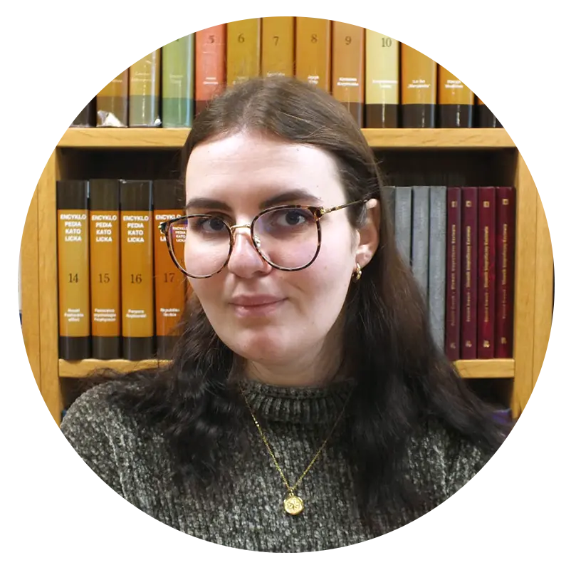 Wprowadza do systemu PATRON książki z katalogu kartkowego, dzięki czemu są dostępne online. Obsługuje czytelników, planuje spotkania w gmachu, jest pierwszym kontaktem po księdzu dyrektorze. Interesuje się literaturą biograficzną.