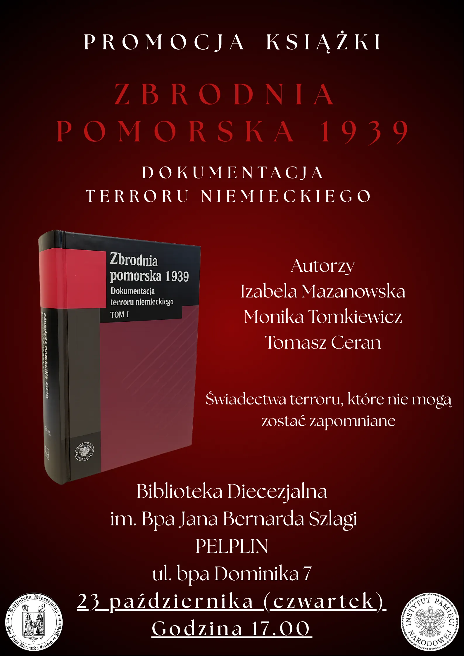 Zapraszamy na wyjątkowe spotkanie poświęcone książce, która wstrząsa i porusza – zbiór dokumentów ukazujących niemiecki terror na Pomorzu w 1939 roku. Publikacja odsłania dramat mieszkańców wszystkich powiatów przedwojennego województwa pomorskiego i pokazuje skalę zbrodni, jakiej nie znała żadna inna część okupowanej Polski.